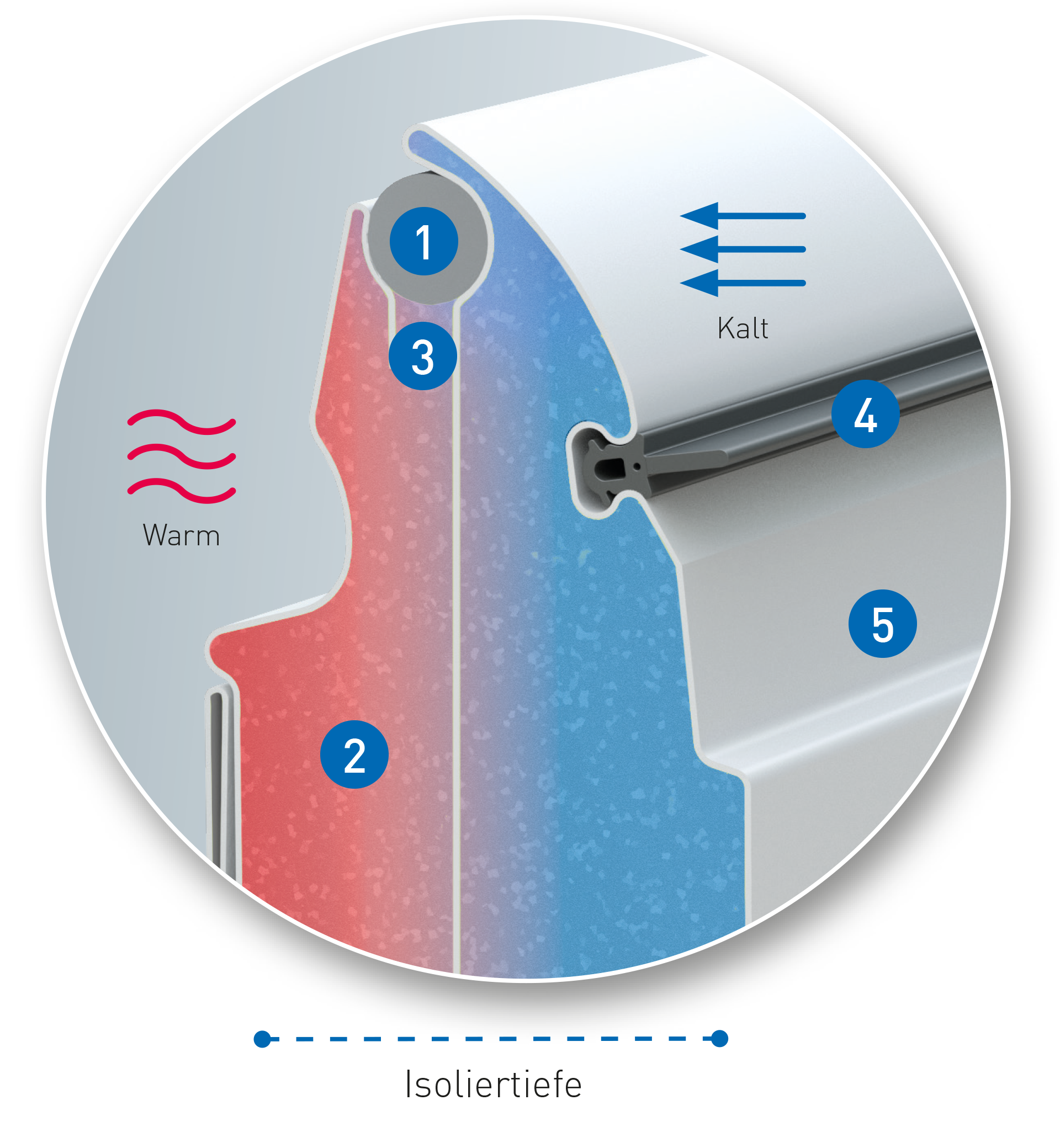 2) Thermische Trennung der Außen- und Innenschale des Tores. Hierdurch werden Wärmeverluste auf ein Minimum reduziert.